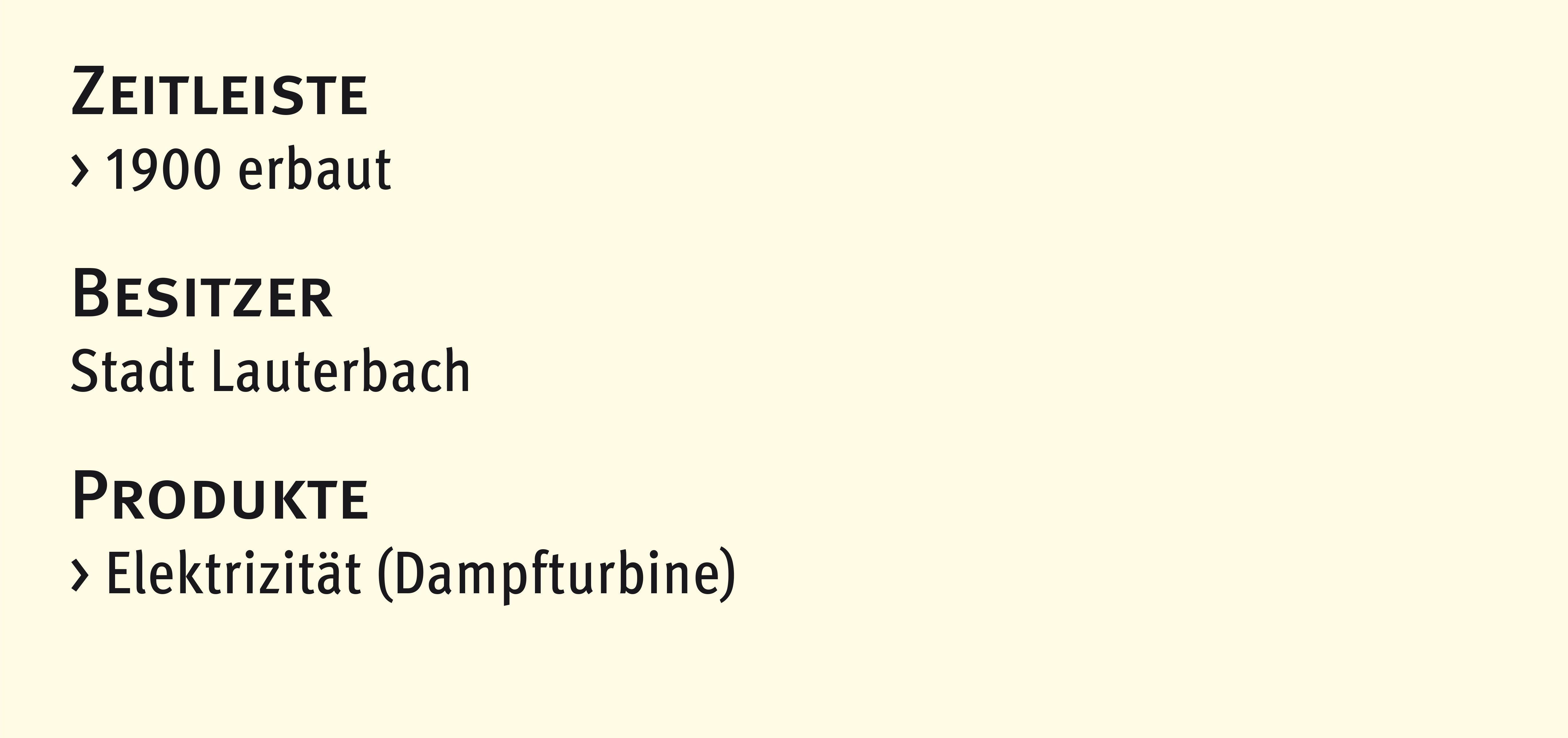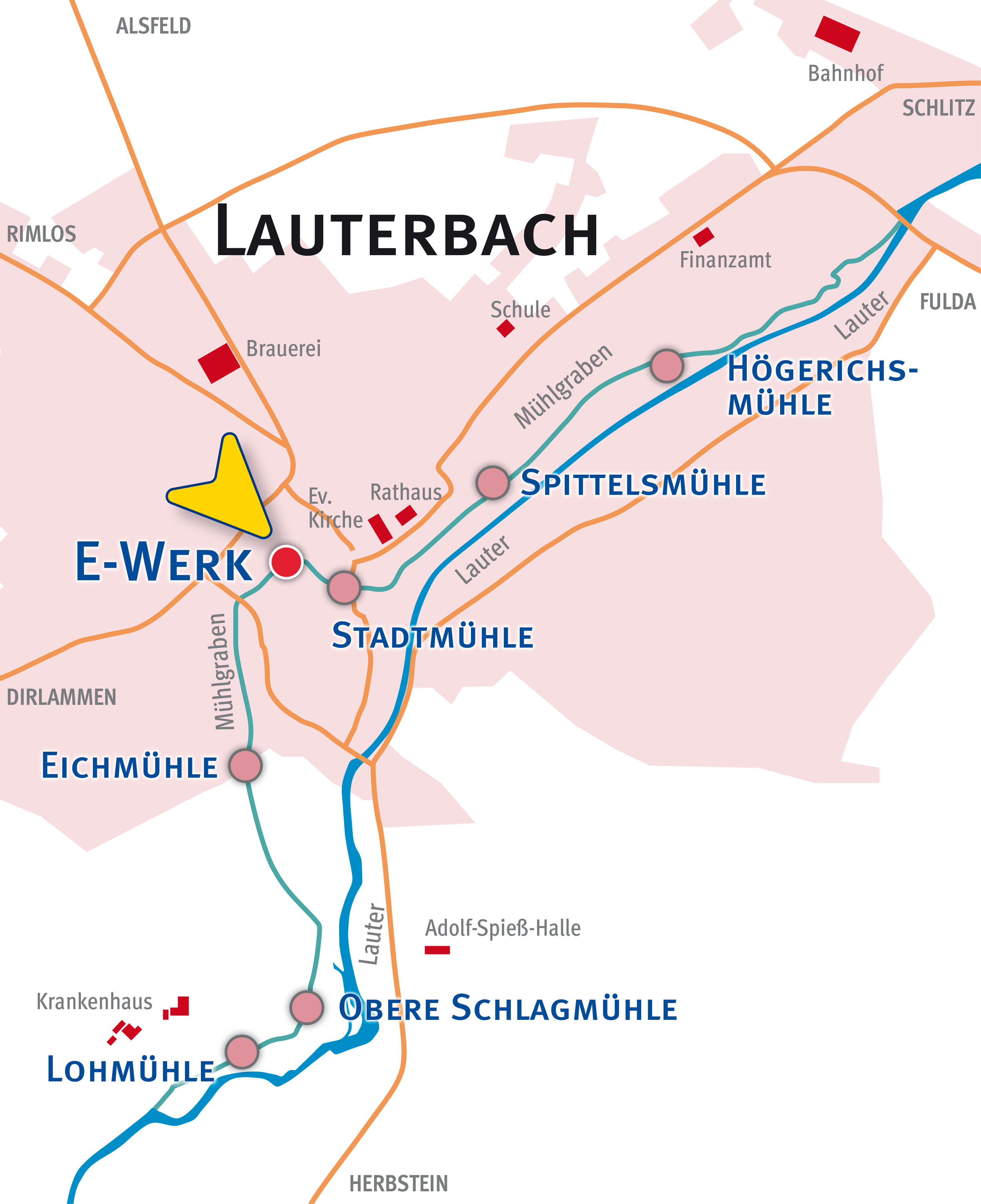 Im Jahr 1899 wurde direkt am Mühlgraben das Elektrizitätswerk der Stadt Lauterbach gebaut. Unsere Stadt verfügte damit vergleichsweise früh über eine eigene Stromversorgung, maßgeblich initiiert durch den damaligen, sehr fortschrittlich eingestellten Bürgermeister Alexander Stöpler.