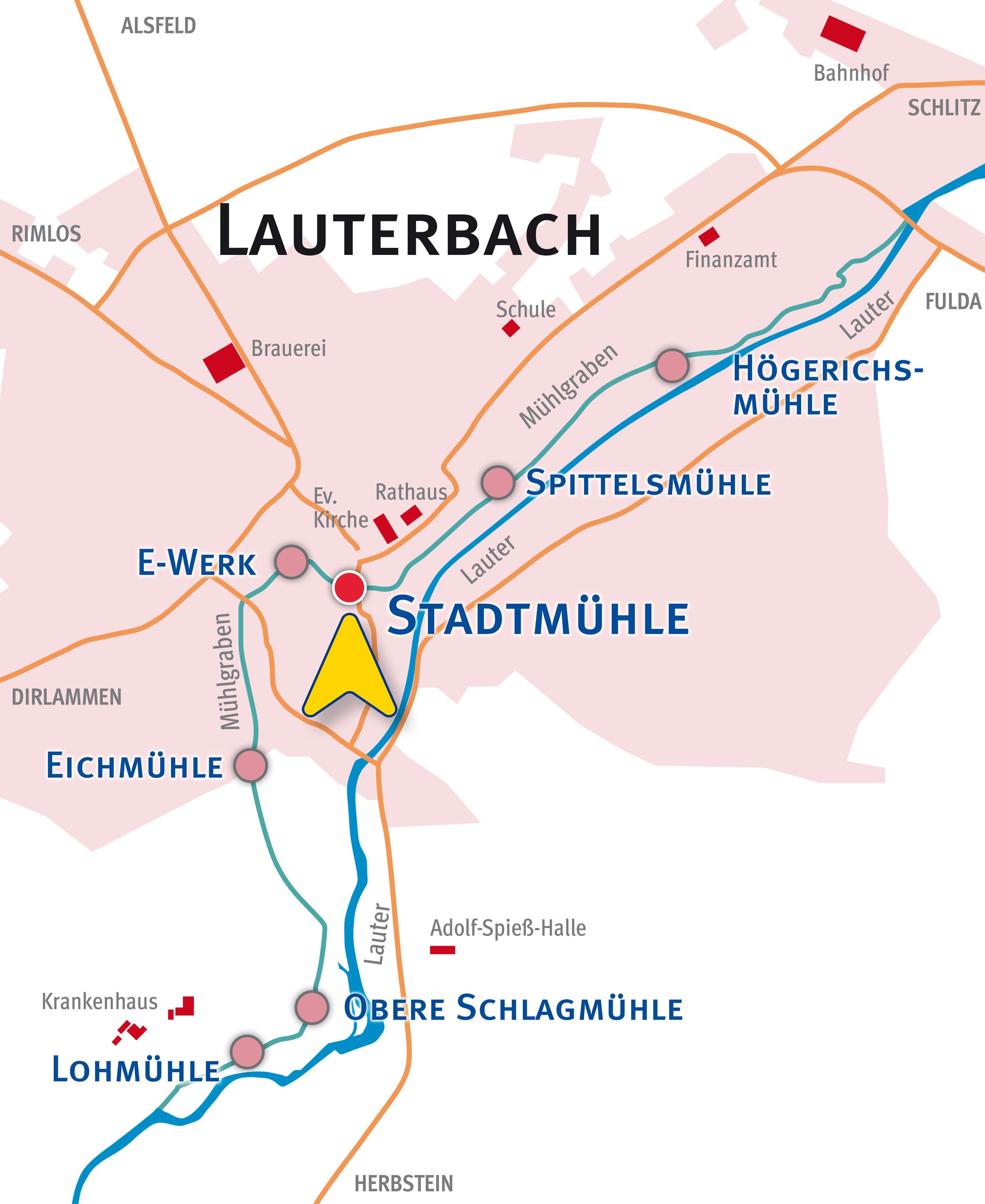 Bereits im 14. Jahrhundert wurde der Kernbau der heutigen Stadtmühle errichtet. Die Mühle befand sich damals noch außerhalb der Stadtmauer und ist heute das älteste steinerne Gebäude in Lauterbach. Hier wurde Korn zu Mehl gemahlen. Der hintere Fachwerk-Gebäudeteil ist noch älter. Sie ging 1846 aus herrschaftlichem in privaten Besitz über. Noch gut erkennbar ist, dass der Mühlgraben rechts an der Mühle vorbei führte, wo auch das Mühlrad saß.