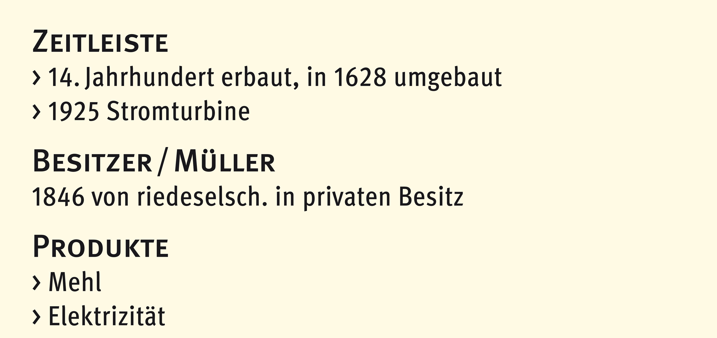 Nach Aufgabe des Mühlenbetriebs wurde 1925 ein elektrischer Generator eingebaut um das E-Werk zu entlasten. Das Mühlengebäude diente dann als Wohnhaus, später wurde im Erdgeschoss zunächst ein Laden für Töpferwaren und heute das Tourist-Center untergebracht.