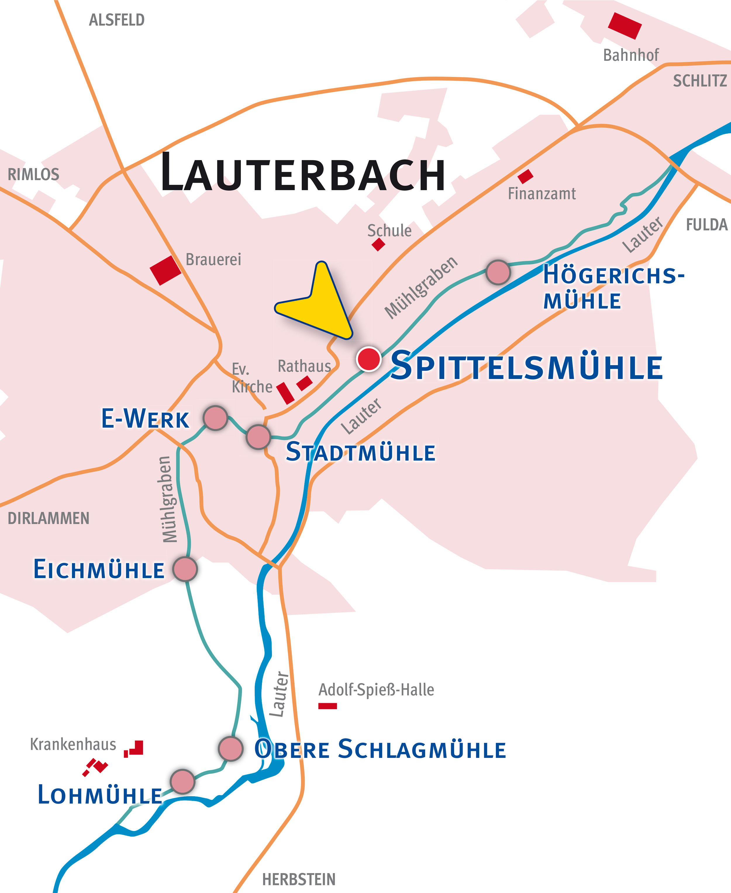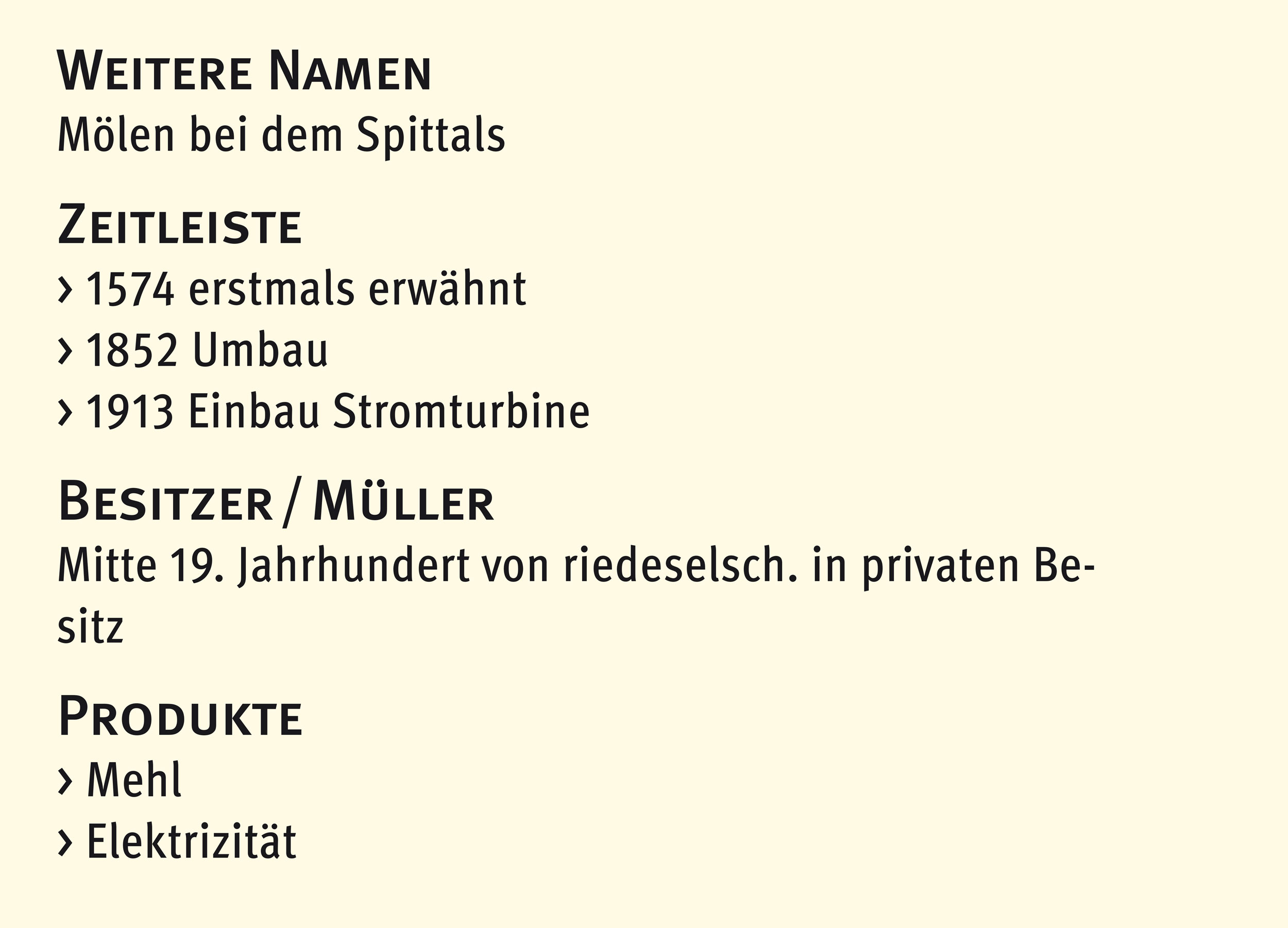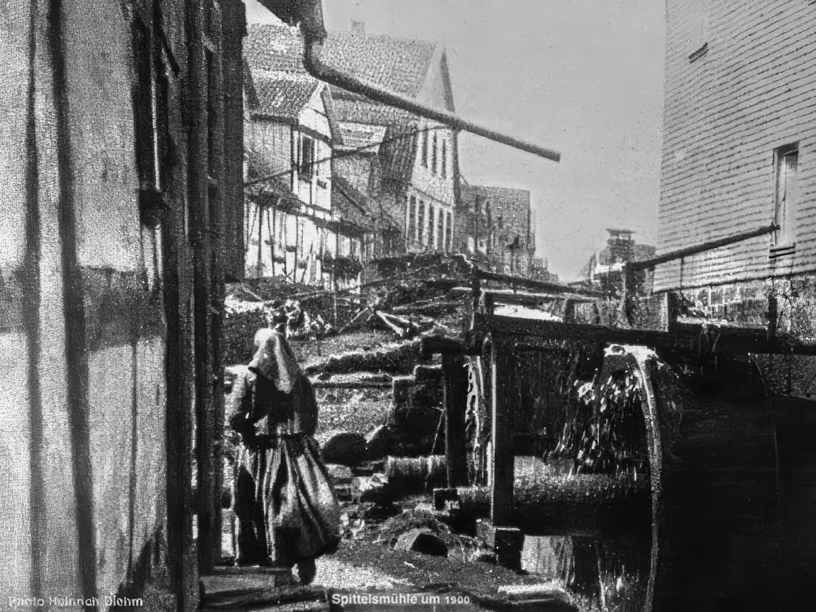 Der Mühlgraben floss rechts am Gebäude vorbei, an Stelle der Mühlräder stehen heute Garagen. Die Mühle wurde 1912 von der Stadt angekauft und zunächst als Lager für Feuerlöschgeräte genutzt. 1913 beschloss die Stadt, die Wasserkraft des Mühlgrabens zur Stromerzeugung zu nutzen und baute eine 10 PS starke Turbine in die Spittelsmühle ein. Die ehemalige Mühle dient heute als Wohnhaus.