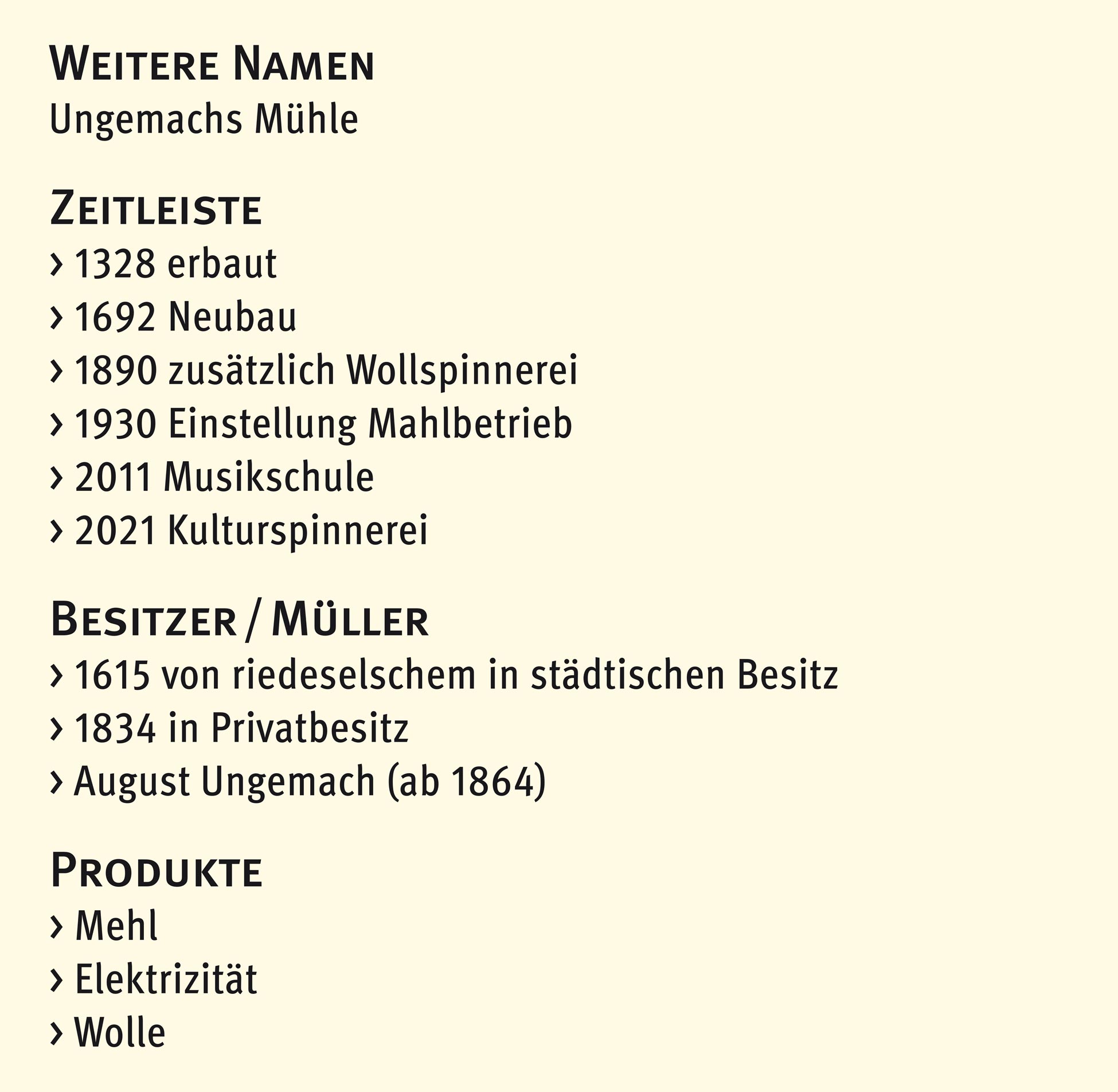 1795 ging man auf eine dreijährige Pachtdauer über, die jeweils am Michaelistag begann und endete. 1834 trennte sich die Stadt von der Mühle und versteigerte sie. August Ungemach kaufte die Mühle 1864 und betrieb sie zunächst weiterhin als Mahlmühle. Ab 1890 zusätzlich mit einem Generator zur Stromerzeugung und einer Wollspinnerei, für die 1899 und nach dem Zweiten Weltkrieg Erweiterungsbauten erstellt wurden. Der eigentliche Mühlenbetrieb geriet mehr und mehr in den Hintergrund und wurde 1930 ganz eingestellt. Die Spinnerei arbeitete noch bis in die 90er Jahre des vergangenen Jahrhunderts.